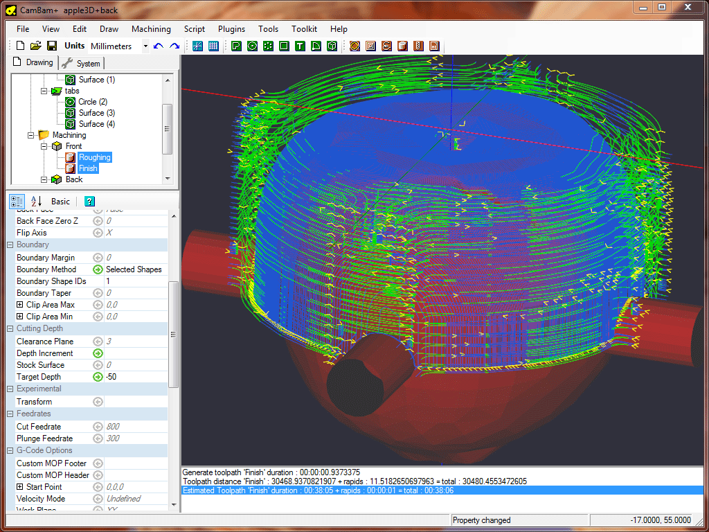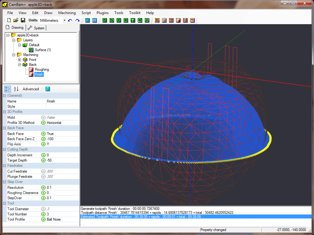 In this example, the table surface Z=0 is used, so the model is rotated about Z=0 to machine the back face. |