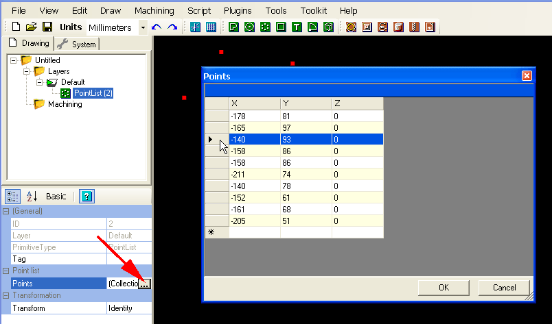 The points in a point list can also be edited in a tabular format by clicking the [...] button to the right