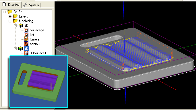 2D pocket operations are used to clear the flat areas of the mode. The inset image shows the results when simulated using CutViewer Mill.
