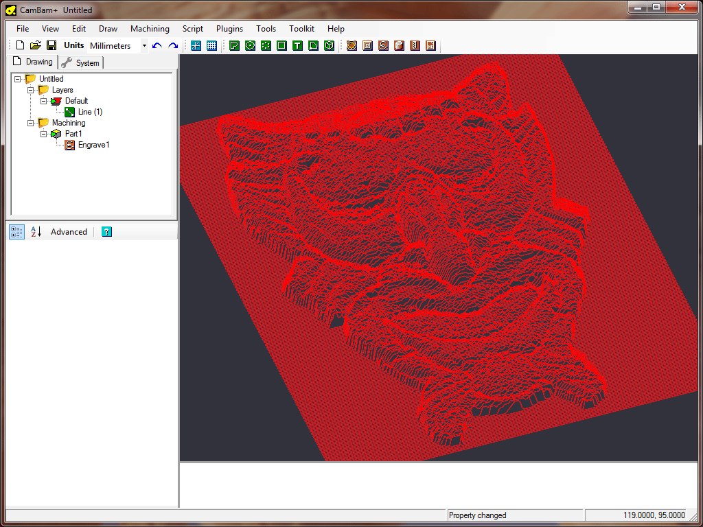 As well as generating a 3D Line object that contains the resulting heightmap, the plugin also creates an engraving machine operation linked to this line. An engraving operation is used as these are designed to 'follow' the associated geometry. In effect it is using the 3D line as a toolpath.