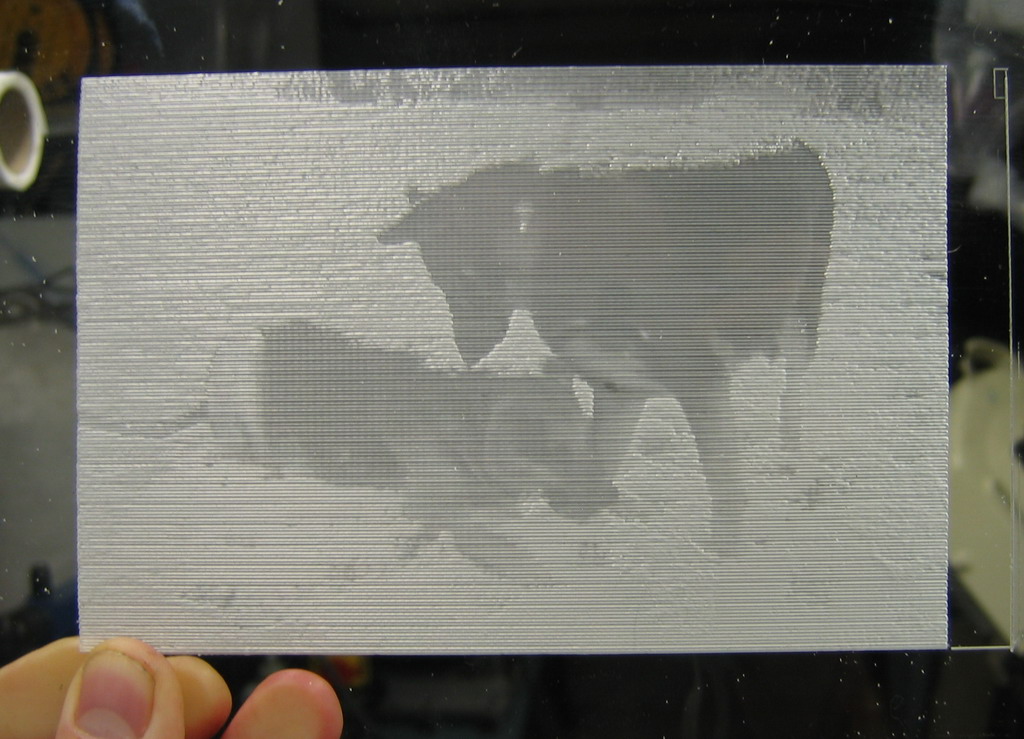 A lithopane is another variation on this theme, where an image is engraved into a thick translucent material and viewed with back lighting. Lithopanes are typically inverted with the deeper cuts resulting in thinner material and more light shining through.